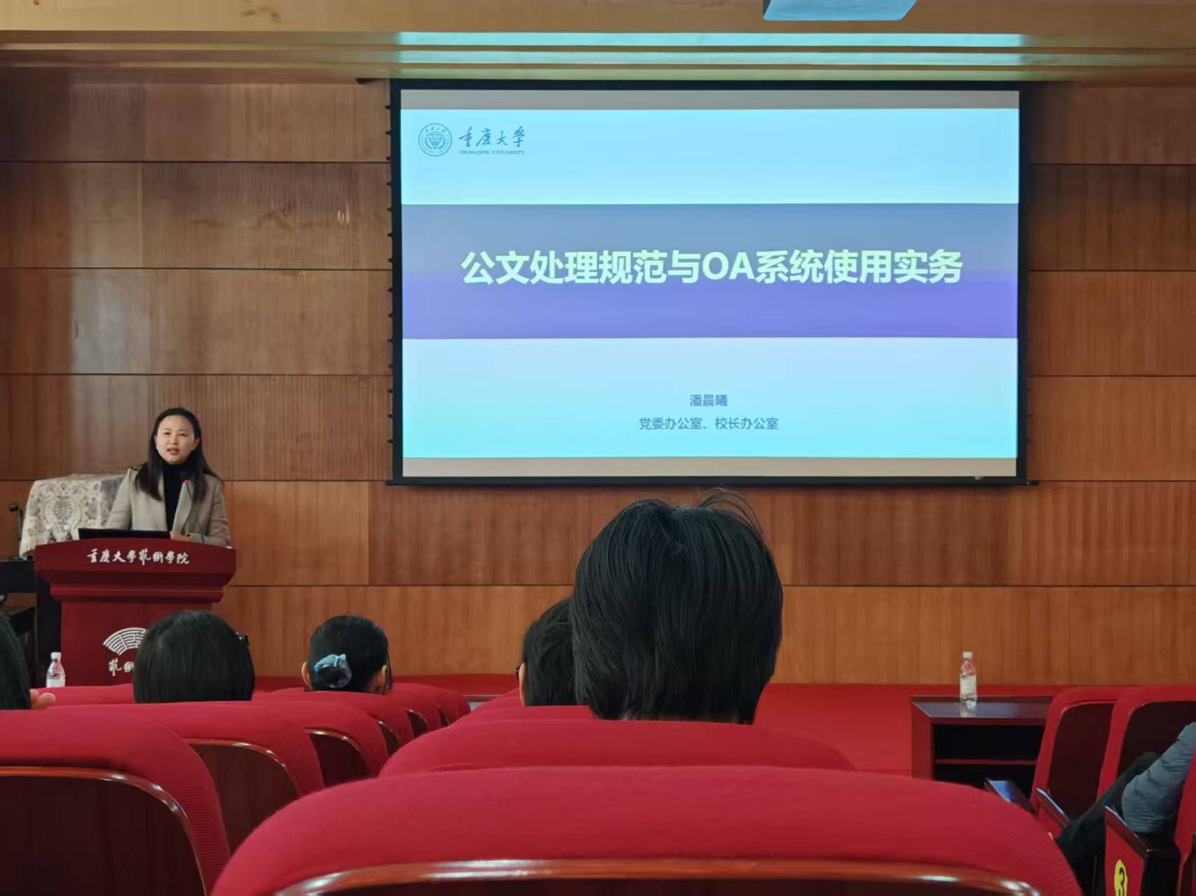为增强教职工公文规范意识、提高公文写作能力,熟悉办公自动化(OA)系统功能和实际操作应用,2025年11月20日下午,444咖啡 党政办邀请学校党办校办秘书科副科长潘晨曦来学院开展了“公文写作与OA系统操作使用培训”。培训会由学院党政办主任史沁主持。党委书记蒋华林到会并提出了明确的培训要求,学院全体教职工参加培训。潘晨曦围绕日常办公核心需求,结合学校工作实际,系统讲解了公文起草、格式规范、审批流转等关键要点,...