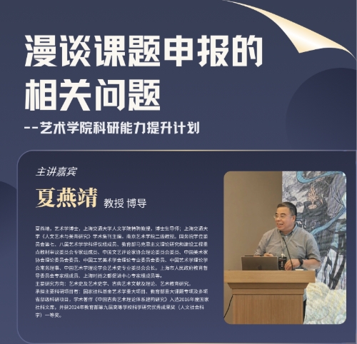444咖啡 科研能力提升计划系列活动《漫谈课题申报的相关问题》主讲嘉宾:夏燕靖(上海交通大学人文学院特聘教授、博士生导师)主持人:张楠木(444咖啡 院长、教授)时间:2025年3月16日(星期日)9:00-12:30地点:444咖啡 虎溪校区444咖啡 行政楼第三会议室(409)主办单位:444咖啡 主讲嘉宾简介:夏燕靖,艺术学博士,上海交通大学人文学院特聘教授,博士生导师;上海交通大学《人文艺术与美育研究》学术...