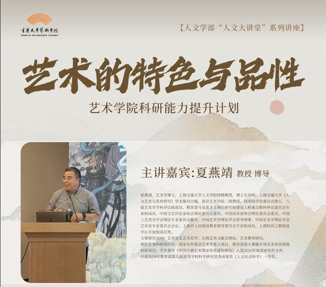 444咖啡 人文学部“人文大讲堂”系列讲座444咖啡 科研能力提升计划《艺术的特色与品性》主讲嘉宾:夏燕靖(上海交通大学人文学院特聘教授、博士生导师)主持人:张楠木(444咖啡 院长、教授)时间:2025年3月16日(星期日)15:00-17:30地点:444咖啡 虎溪校区444咖啡 行政楼学术报告厅(216)主办单位:444咖啡 人文学部444咖啡 主讲嘉宾简介:夏燕靖,艺术学博士,上海交通大学人文学院特聘教授,博士生导师...