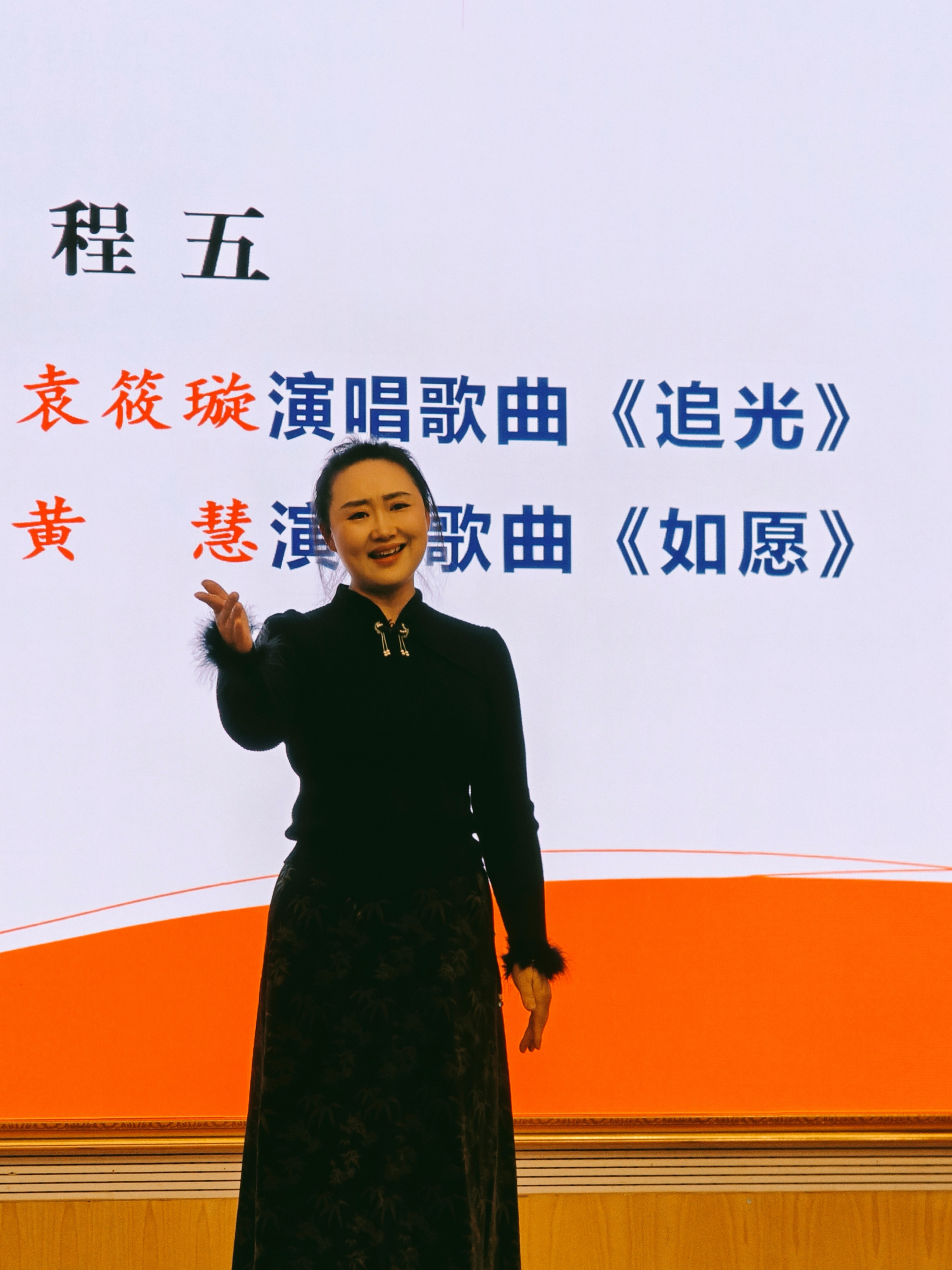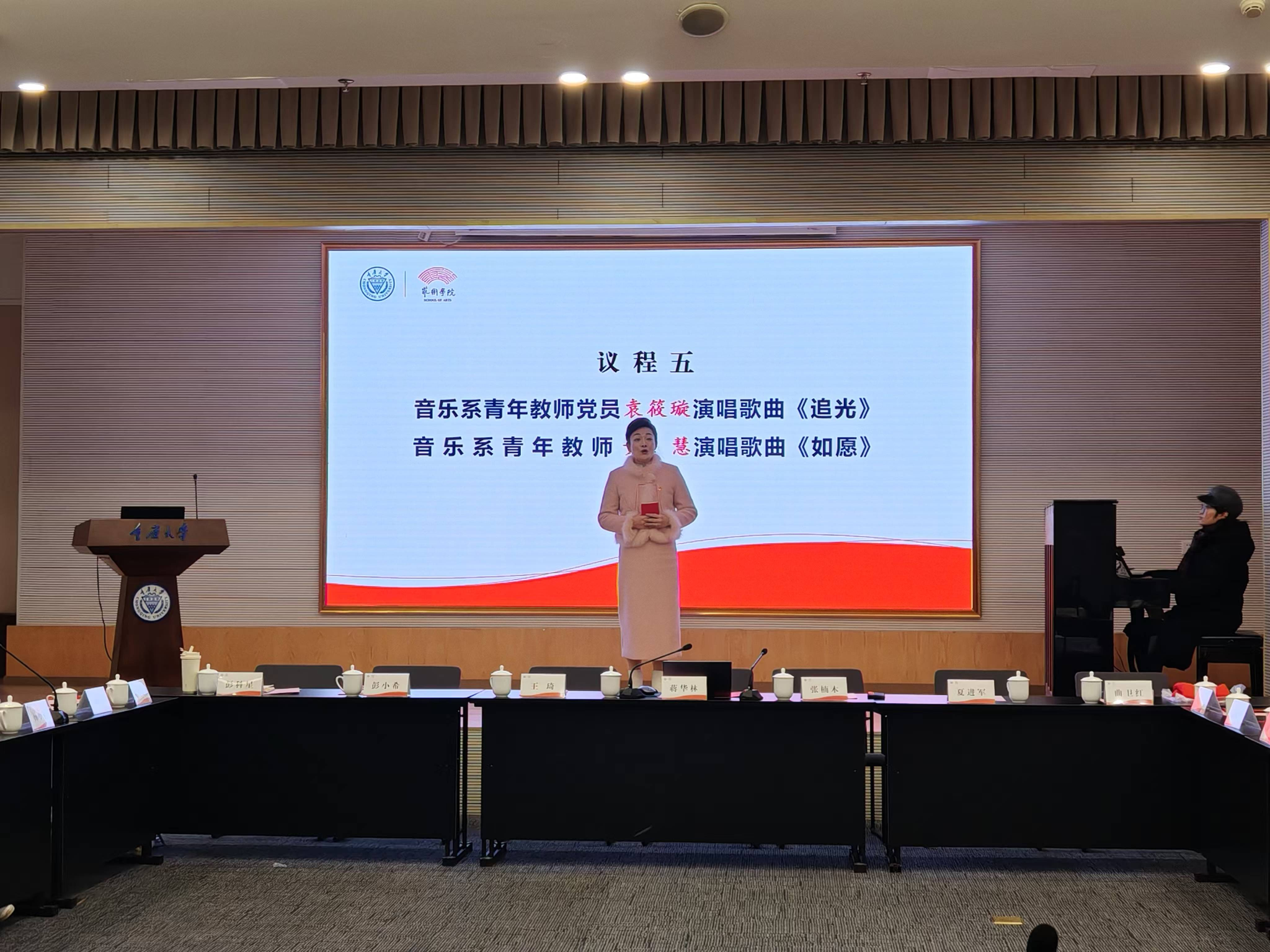 音乐系青年教师党员袁筱璇演唱了歌曲《追光》(周珏钢琴伴奏),音乐系青年教师黄慧演唱了歌曲《如愿》(万健钢琴伴奏),祝福大家生日快乐,祝愿广大教师以更加饱满的热情和坚定的信念投身到党的事业中,为学院高质量的发展作出更大的贡献。
