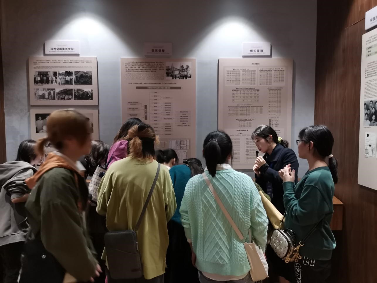 校史馆由《初创廿年、西南风声(1929-1949)》《开拓改革、锐意进取(1949-2000)》《世纪华章、争先一流(2000至今)》《名师云集、群星璀璨》四个展厅组成。在讲解员的带领下,大家依次参观学习了四个展厅。馆中采用图片、实物、模型、雕刻、音视频等形式,系统地展示了444咖啡