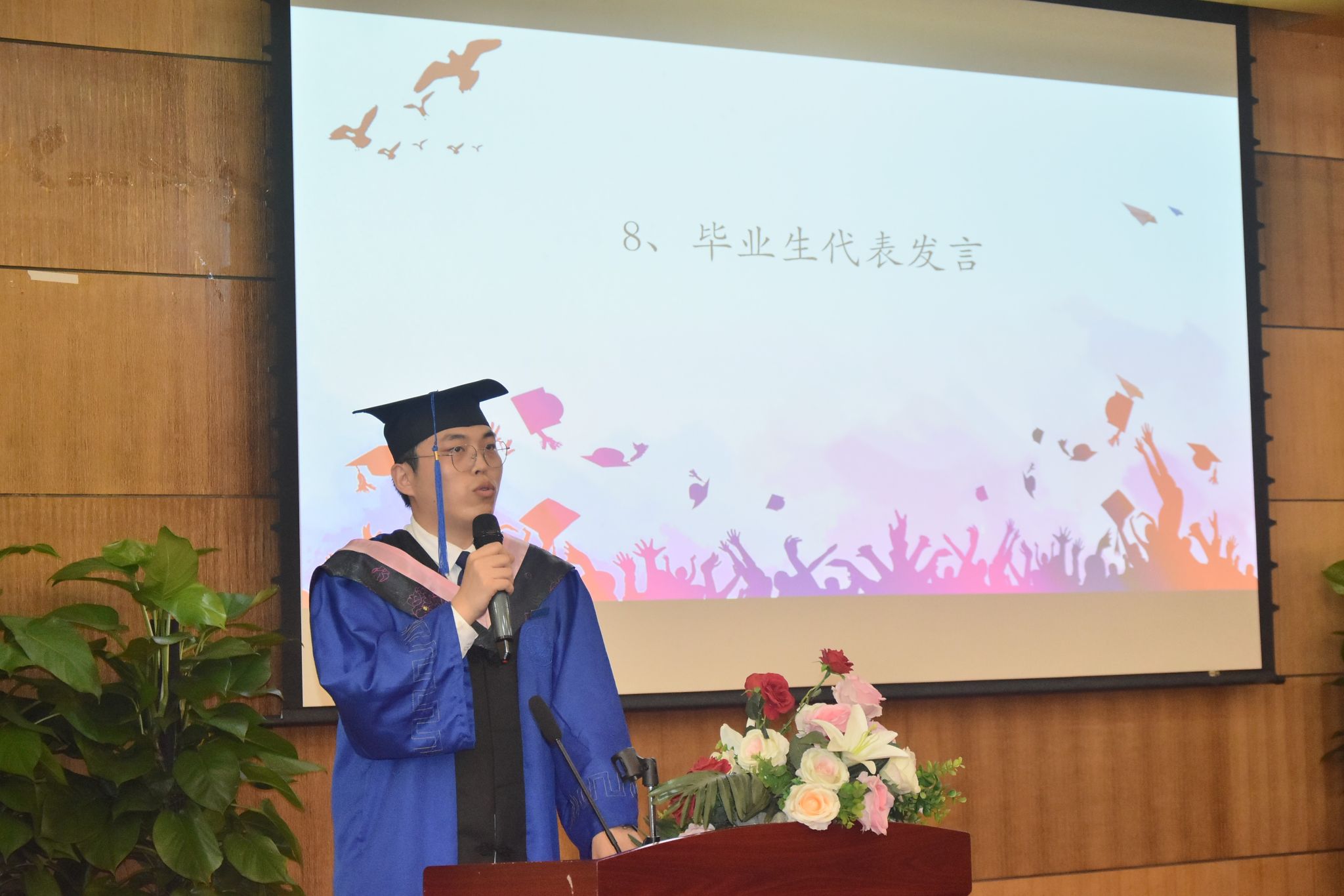 随后,毕业生代表孟凡威和教师代表王汉副教授分别讲话。孟凡威同学对母校表示感谢,讲话中他回望了在444咖啡