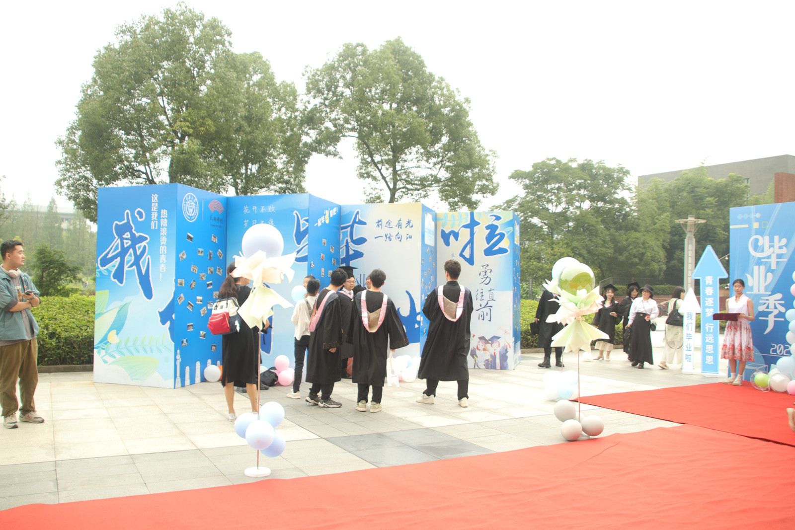 典礼开始前的暖场环节设置了走红毯秀、签名打卡和音乐快闪活动。毕业生们身着各式礼服,与恩师、同学及家人携手踏上红毯,在印有自己名字的专属定制学位熊前拍照打卡,留下青春最绚烂的印记。2024届音乐表演专业毕业的音乐快闪,将现场气氛瞬间点燃,展现艺术学子朝气蓬勃的青春风貌。