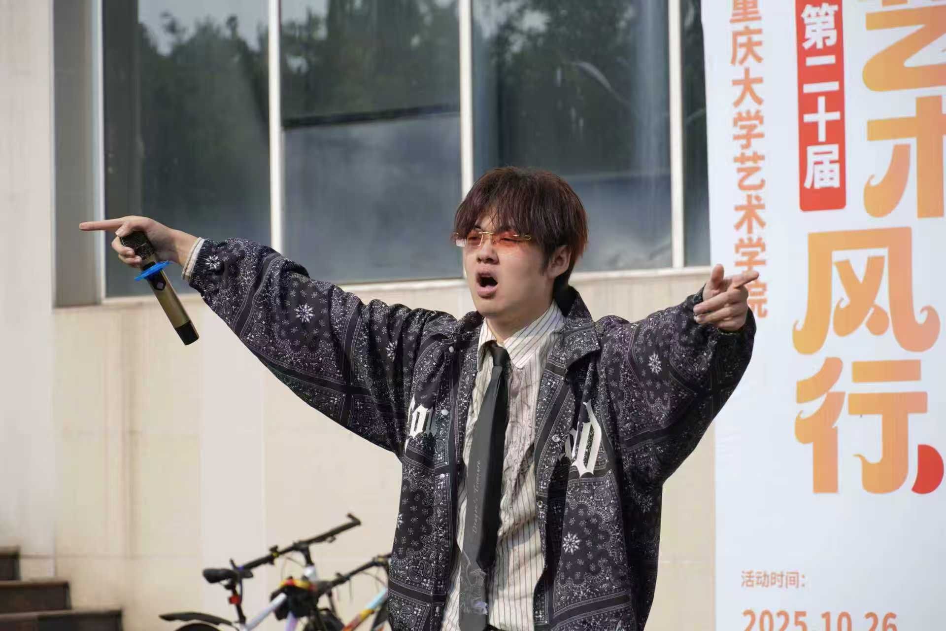 开幕演出以三段节目定格“多元融合”:2023级和2024级设计学类专业5名同学用现代舞《Psycho》的肢体语言诠释青春力量;2023级舞蹈表演专业学生周靖辉以民族舞《叶云万里》翩跹勾勒山河;2025级音乐表演专业学生姚政吉则以节奏火爆的Rap《朝天门》演绎山城烟火,为整场活动定下“向美而行”的基调。