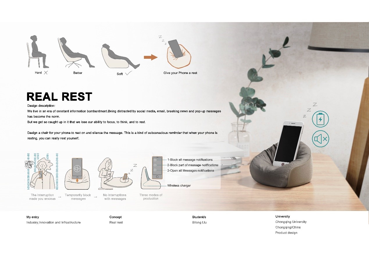 该设计通过使用者在对手机进行充电时对手机内的信息进行筛选和限制,通过设计引导,协助使用者在精神层面进行自我休息。
