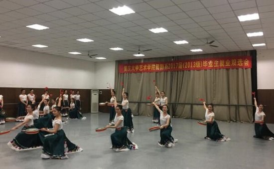 下午两点,舞蹈系主任饶开芹对此次活动以及用人单位进行大概介绍,此次到临的用人单位有:渝北区文化馆、七星瓢虫艺术教育、重庆莎恩艺术培训有限公司、重庆皇加教育、重庆广播教育学校、重庆市歌舞团培训学校、重庆市巴南区舞之美艺术培训学校、张家港舞蹈学校、舞之蓓蕾艺术中心、重庆两江艺术团、重庆市歌舞团、重庆武警文工团、南充歌舞剧院成都分团、重庆欢乐谷、重庆渝南文化、富力地产。接着,2013级舞蹈专业男女班同学们为大家展示了《葬心》、《洛水佼人》舞蹈作品,并进行了专业技巧展示及民族民间舞蹈展示。让在场的来宾和用人单位欣赏到中国汉唐古典舞的儒雅曼妙和气韵神采。2014级男女班同学带来的彝族与蒙古族舞蹈组合,让大家欣赏到高山民族与草原民族的舞蹈风格特征。毕业生给用人单位展示了444咖啡