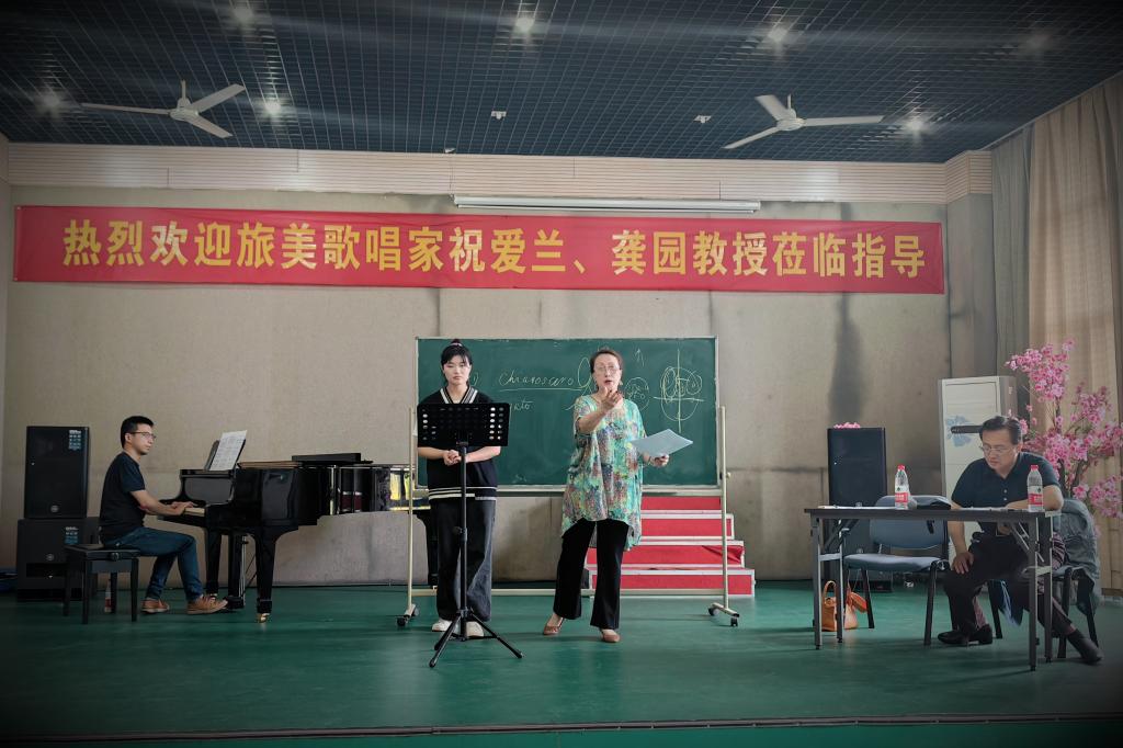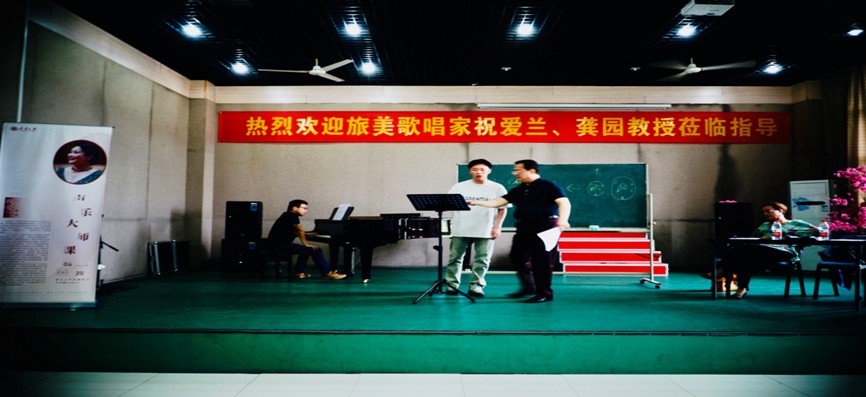 在基础理论的讲解过后讲座进入实践教学环节,由四位不同年级的本科学生上台演唱。祝教授与龚教授分别对几位同学的演唱一对一做出了细心的指点,两位教授时而温文尔雅,循循善诱,帮助学生认识到自己在歌唱方面存在的不足之处,时而激情澎湃,旁征博引,为学生做出精彩的示范。同学们被两位教授的风采与学识所折服,课程中时常掌声雷动。