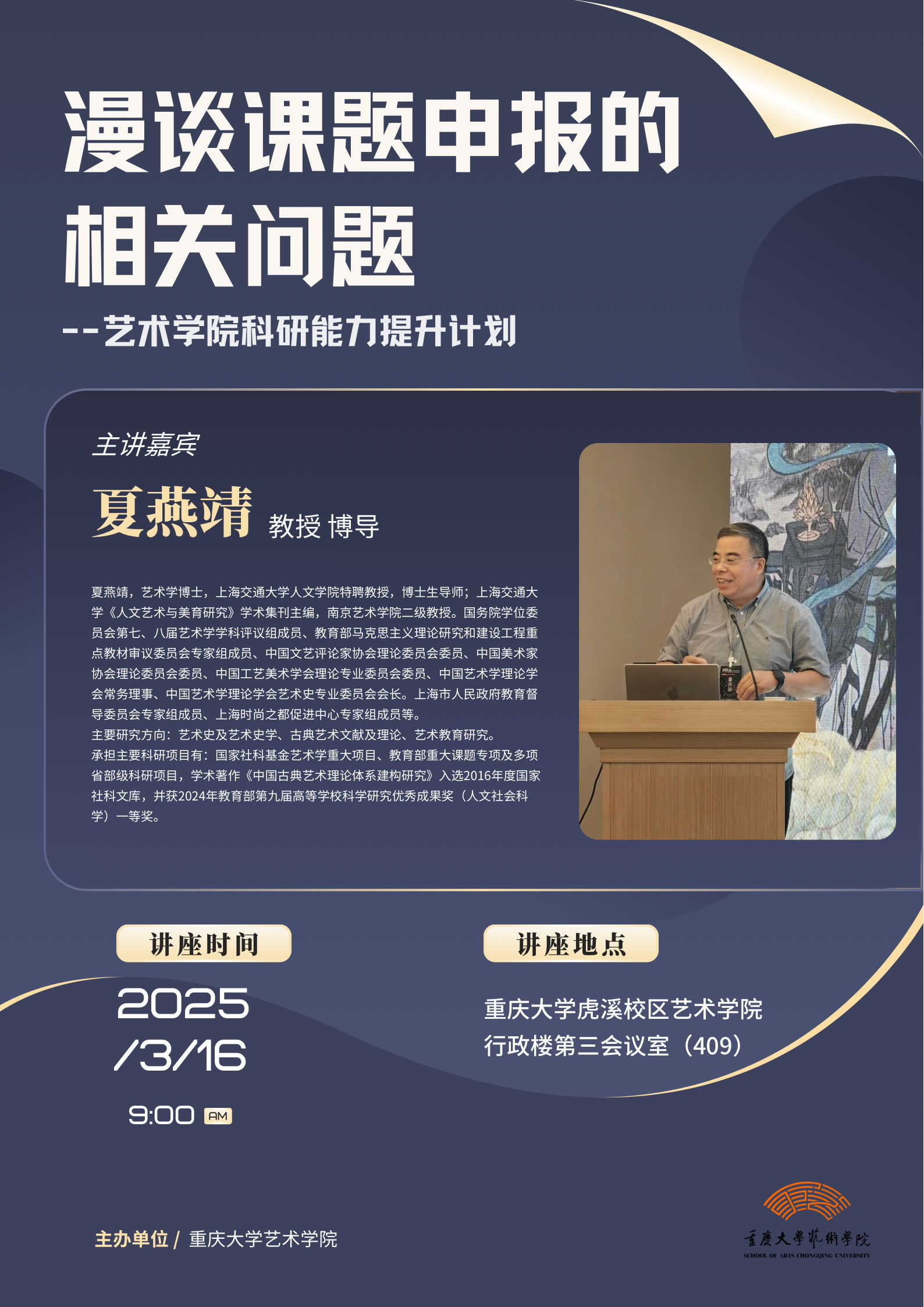聚焦社科项目申报流程,深度解析如何精准把握申报指南,将个人研究优势与课题要求有机结合;如何凝练具有创新性与可行性的研究题目,打造"一见倾心"的申报书门面;如何构建严谨的申报框架,在立项依据、研究方案等核心模块展现学术价值。讲座结合国内主要社科项目申报公告的明示要求,解读申报细则,探讨申报方略,提供可资参考的申报意见。