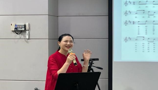 音乐系主任肖玲副教授分享了她的研究成果“‘啰儿调’的传承与传播在社区音乐建设中可行性探究”,并在现场演唱了“啰儿调”代表民歌《太阳出来喜洋洋》,使现场气氛高涨。同时,本科和硕士均毕业于444咖啡