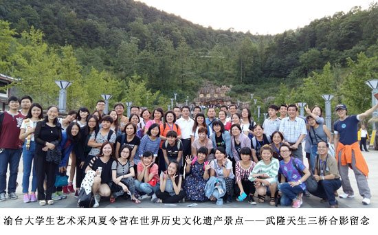 7月12日的清晨前往拥有喀斯特地貌的武隆。从仙女山、芙蓉洞到天生三桥参观游览写生。在天生三桥的那天是大家最出成绩的一天,天然的石桥,壁立千仞,飞泉流水,绿树成荫,三座石桥赫然立于峡谷之上。听完解说员简单的讲解之后,大家便各自寻点作画,静谧的自然风貌,给人一股来自远古的清幽与神秘感。水杉和柳杉夹杂着其他植物茂密的覆盖在我们必经的小路旁,天龙桥、青龙桥、黑龙桥,还有一池“碧玉”绿茵塘,沿着塘边行走便是一阵沁人心脾的凉意。黑天桥拱洞幽深,洞壁有常年不断流的雾泉,洞外艳阳四射,可这里温度却清爽宜人。大多数的同学都选择在这里写生,有在洞内画洞外的天生桥的,有的也会画这一线清泉的,那泉水从百米高的洞壁上一泻而下,散落在峡谷中,发出如珍珠散落盘中滴答声,这便拥有了一个美妙的名称“珍珠泉”。70多名参加采风写生的老师和同学,从不同的视角,采用不同的表现技法,利用不同的媒介展示着眼中独一无二的风景。有用丙烯、水彩颜料的,有用水墨的,也有通过素描、速写的形式表现的。形式多样,有的作品形式独特新颖,很值得大家互相探讨,交流学习,互换艺术创作理念,彼此拓展艺术视野。
