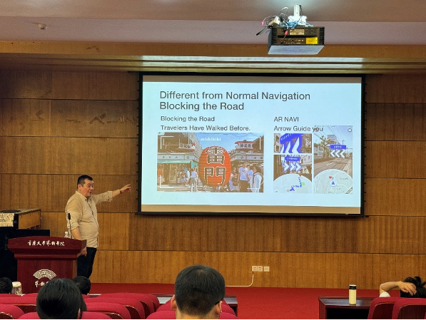随后,渡边诚在学院报告厅开展题学术讲座,讲座由彭小希主持。讲座中,渡边诚系统回顾了日本设计教育的发展历程,介绍了千叶大学的教学环境、课程设置及学科发展情况,并结合多个案例,生动讲解了在智能时代,如何借助AI、AR、元宇宙等前沿技术推动设计创新。讲座吸引了设计学系师生参加,现场互动热烈、气氛融洽。