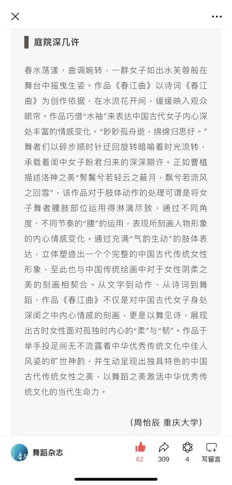 与此同时,由中国舞蹈家协会主办,中国舞蹈家协会理论评论委员会、《舞蹈》杂志社承办的第十四届中国舞蹈“荷花奖”古典舞评奖优秀网络评论征集活动伴随赛事展开。周怡辰同学撰写的两篇短评脱颖而出,连续入选并刊登于“舞蹈杂志”微信公众号。第一篇分析了作品《春江曲》中蕴含的深邃情感,并探讨舞蹈之美如何激活中华优秀传统文化的当代生命力;第二篇则从作品《故园·1900》中提炼出对家国情怀的深刻反思,提出对于传统文化资源在新时代背景下的价值重塑。