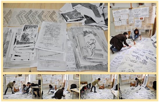 4、为获得创作构图的崭新面貌,团队成员充分发挥各自学术特长或创作优势,群策群力,各司其稿,汇总研讨,遴选最佳方案,即在基本统一意见后,进而统一完成设计雏形,再即进行反复推敲绘制了16次图稿,力求使其渐趋完善。