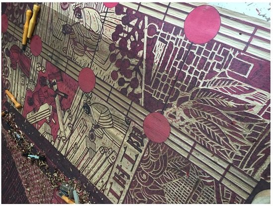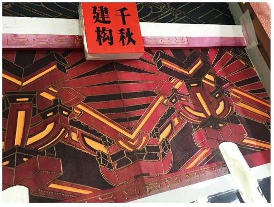 “中华营造法式”,是以宋《营造法式》为基础,以“建构千秋”为主题,以历时性和共时性相交叉的方法打通中华建筑文明的千年脉络,实现文本向图式的转换,创造性地运用“堆木拼版”的原版木雕与其他绘画技法综合运用的多元形态实现了 “中华营造法式”的三维立体呈现,此“版画”造型样式在整个“工程”中具有唯一性。