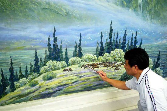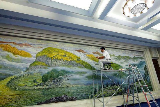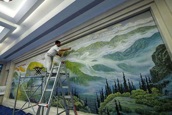 记者在现场看到,《碧水青山》以山水为主要表现元素,远看大气磅礴,白云、青山、绿水层次分明,近看瀑布、民居、牛羊、船橹别有情趣,各成一处小景。