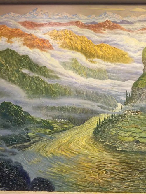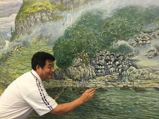 另外,许世虎教授介绍到,这幅作品中,他采用了中国画的散点透视,以工艺制作为基地,利用油画颜料描绘,使作品呈现出中国画的飘逸流动和油画的厚重肌理。