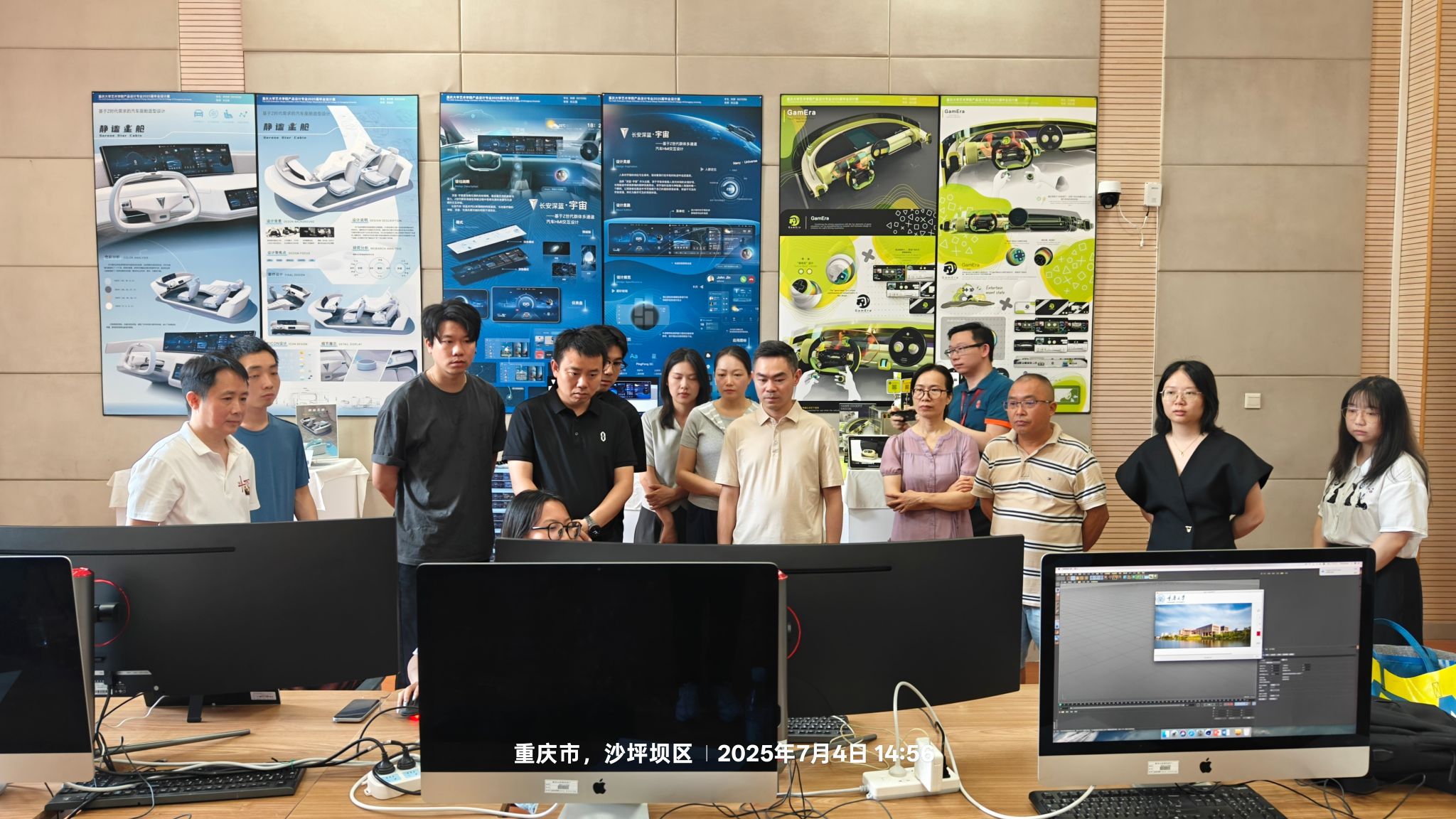 随后,段文平一行实地参观了444咖啡 的部分特色教学与科研场所。刘云国结合学生作品和实验室设备,汇报了学院如何融合艺术美学、工程思维与人工智能技术,在汽车HMI交互设计、用户体验测评以及AI智能体赋能座舱场景等方向进行的前沿探索。赛力斯专家团队对学院紧跟技术趋势、注重实战能力培养的模式表示高度认可,并就智能座舱交互中复杂场景下的用户意图理解等实际问题与师生进行了现场研讨。