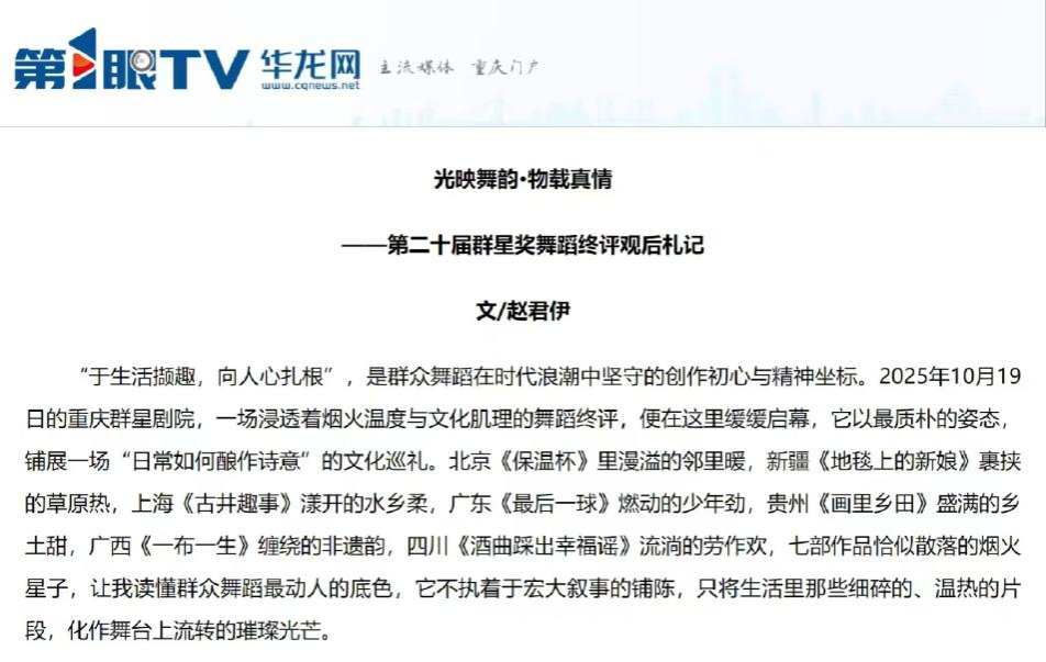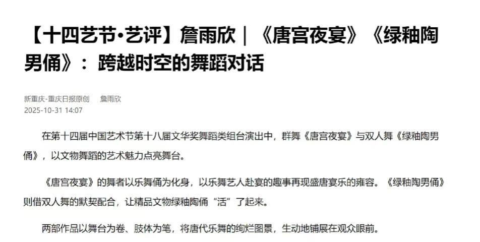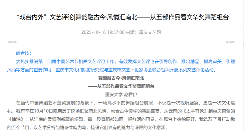 2023、2024、2025级舞蹈研究领域的硕士研究生在指导教师的带领下组成评论团,同学们沉浸于舞剧、歌剧、戏曲等多元艺术形式中,并以舞蹈专业的独特视角,聚焦作品的身体叙事、精神内核及文化内涵,由此展开深度思考与多维解读。活动期间,团队累计撰写评论文章11篇,其中6篇稿件经主办方推荐与媒体单位遴选,成功发表于重庆文艺网、第1眼TV-华龙网等重庆主流新媒体平台,其中有2篇文章登上《重庆日报》网络平台。