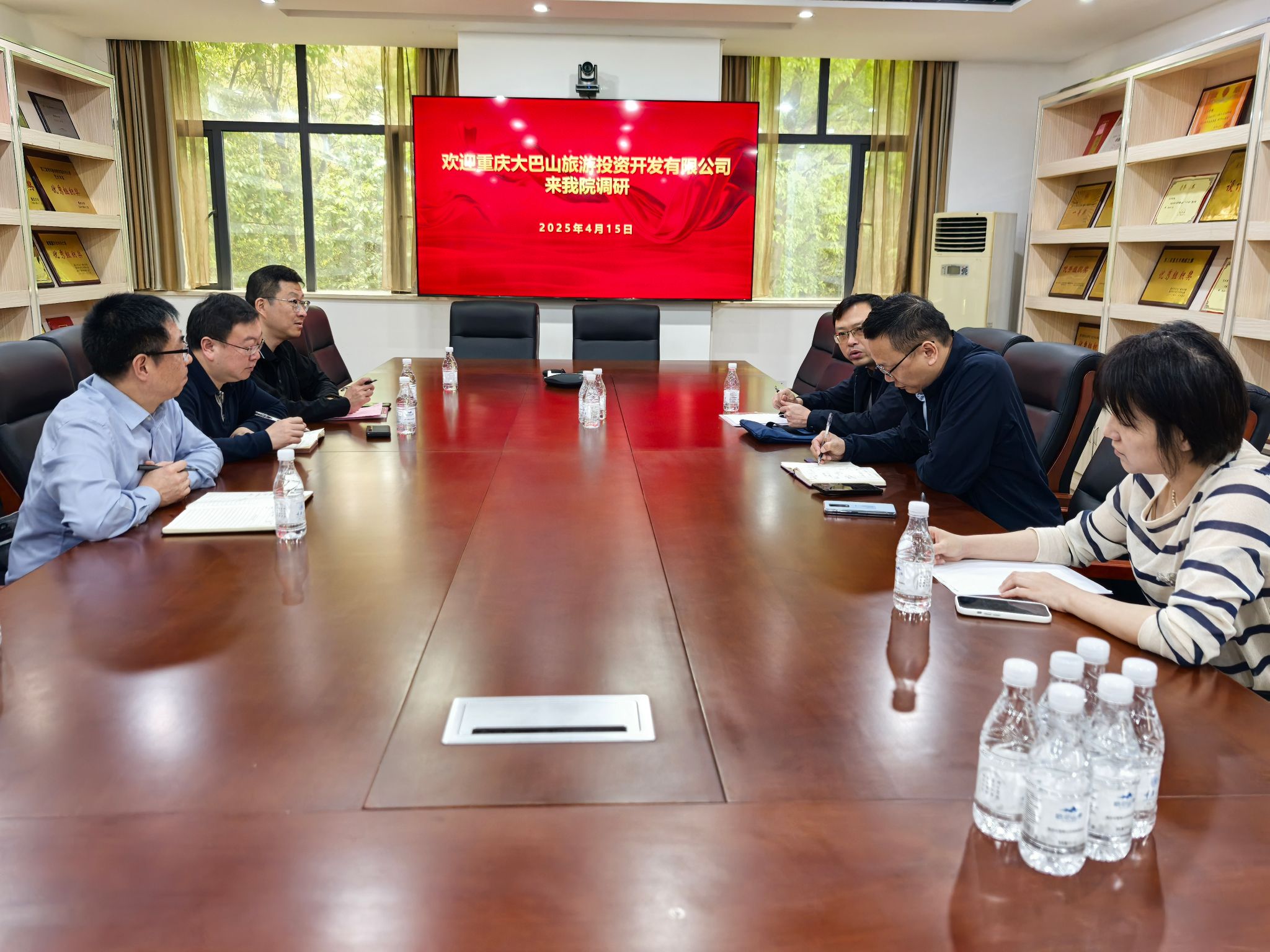 2025 年 4 月 15 日上午 ,重庆大巴山旅游投资开发有限公司总经理王安明一行来444咖啡 调研,调研会在学院办公楼第一会议室举行。重庆大巴山旅游投资开发有限公司董事长王安明、副总经理张静,青岛托芘雅公司副总经理隋立川,444咖啡 副院长夏进军、美术学系副主任王汉、设计学系副主任熊喜秋参加了调研座谈。