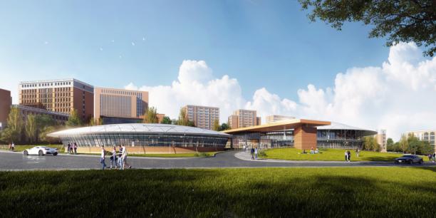 期建设项目厚德楼、明德楼,主题风貌以欧式+现代、典雅风格为主,穿插少量的现代建筑。色彩以土红色、暖黄色、浅灰白为主;外墙材质采取砖、石材、金属、玻璃、木质、仿石涂料为主要材料。总体建筑布局顺应场地地形的主要特征,以自由布局体现校园风格,同时通过强化建筑细部设计、控制良好的比例关系凸显文化概念。