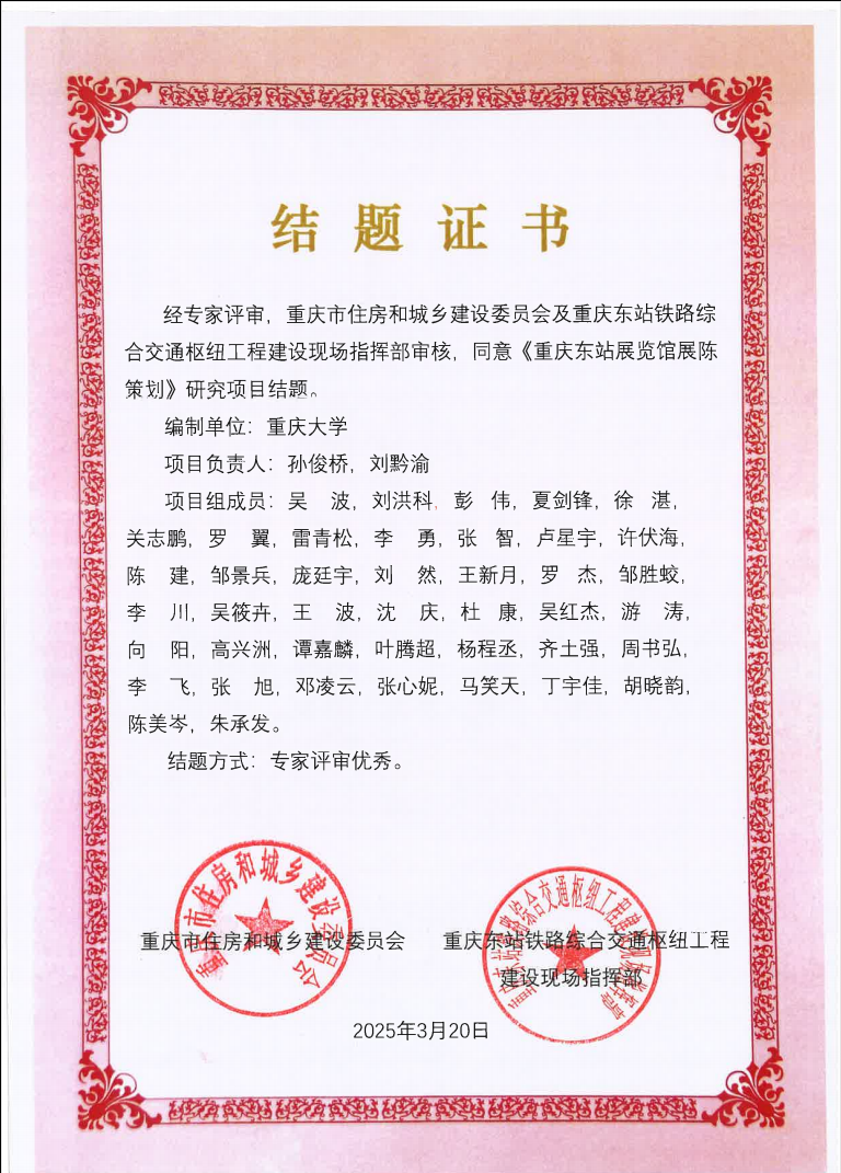 孙俊桥教授团队承担的《重庆东站展览馆展陈策划》项目进行了严格评审。该项目凭借卓越的成果,以优秀等级顺利结题。