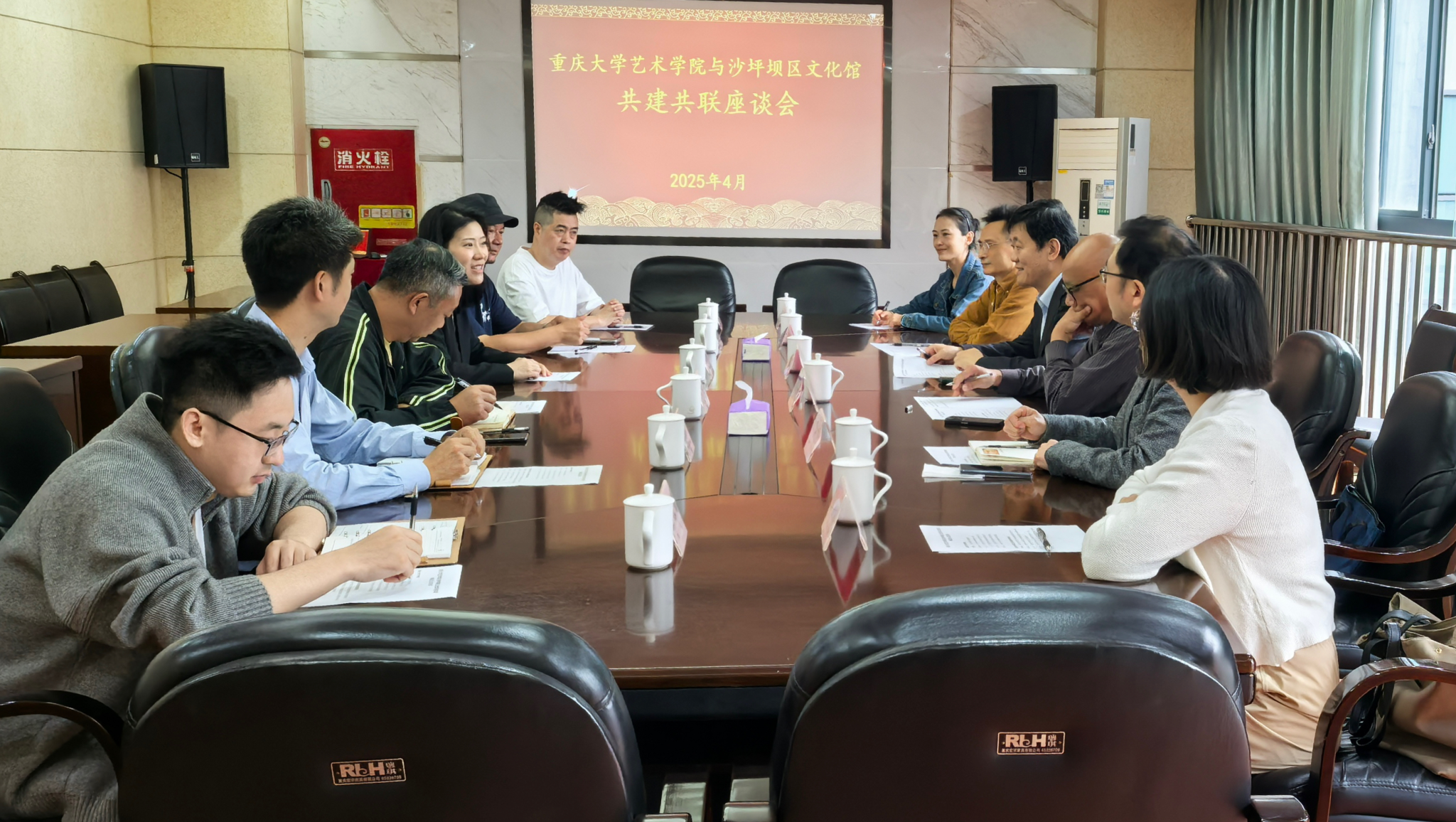 张楠木院长率队赴沙坪坝区文化馆,进行共建共联座谈活动。重庆沙坪坝区文化和旅游发展委员会党委书记汪黎黎、公共服务科科长陈永甫,沙坪坝区文化馆副馆长唐亮、视觉艺术部主任李运来、副研究馆员张洪、艺术部馆员李祥,444咖啡