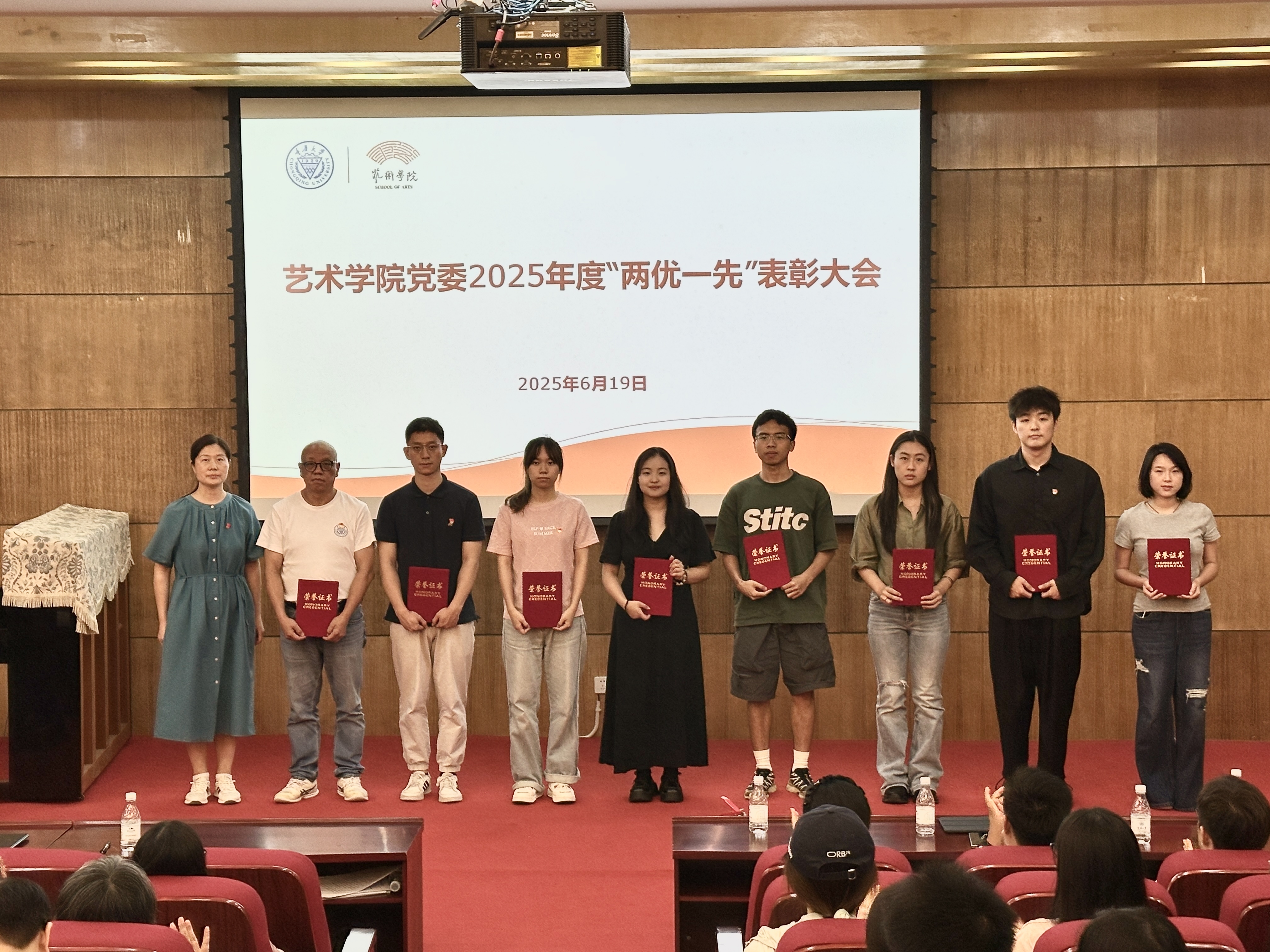 随后举行的是学院党委2025年度“两优一先”表彰大会。为充分发挥先进典型表率示范作用,激励广大党员和党支部奋发进取、创先争优,根据学校党委有关工作安排,学院党委开展了“两优一先”表彰工作,曲卫红等24名党员被评为学院优秀共产党员,罗筱婧等3名党员被评为学院优秀党务工作者,舞蹈系教师党支部和本科生第一党支部被评为学院先进基层党组织。蒋华林宣读表彰决定。蒋华林、彭小希和党委委员曲卫红、彭科星为获奖人员颁发证书。