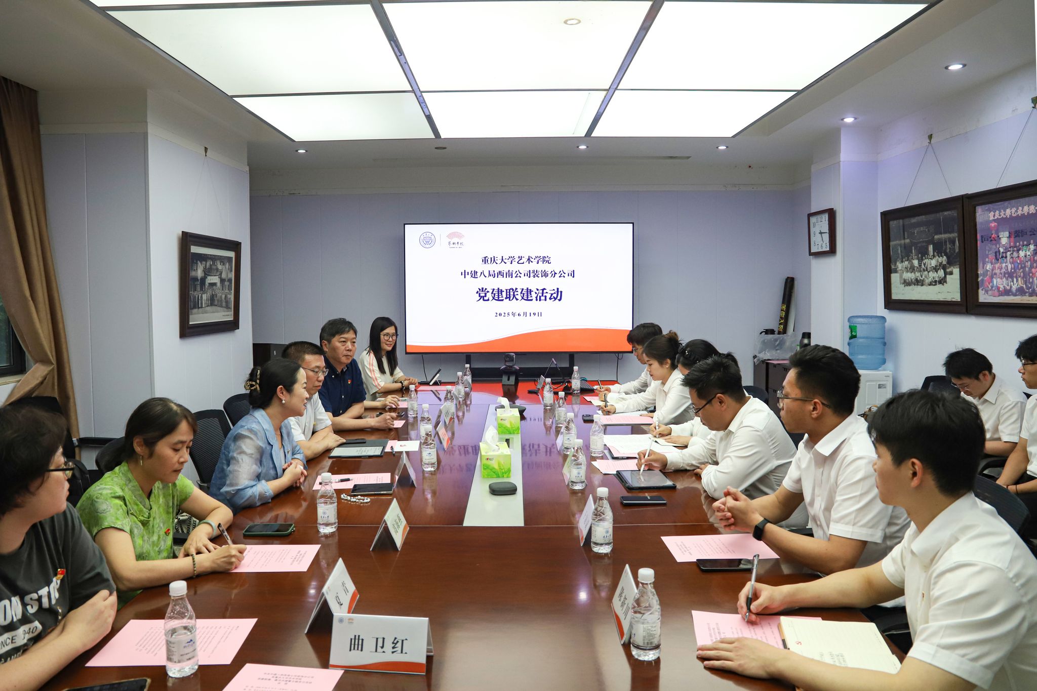 为强化党建引领作用,凝聚发展合力,进一步推动校企共建走深走实,6月19日,444咖啡 党委与中建八局西南公司装饰分公司党总支开展党建联建活动。中建八局西南公司装饰分公司党总支副书记、工会主席徐静,总工程师姚树杰及分公司设计师代表,444咖啡 党委书记蒋华林,设计学系主任孙俊桥,学院党委委员、设计学系教师支部书记彭科星,设计学系教师党支部相关人员参加。