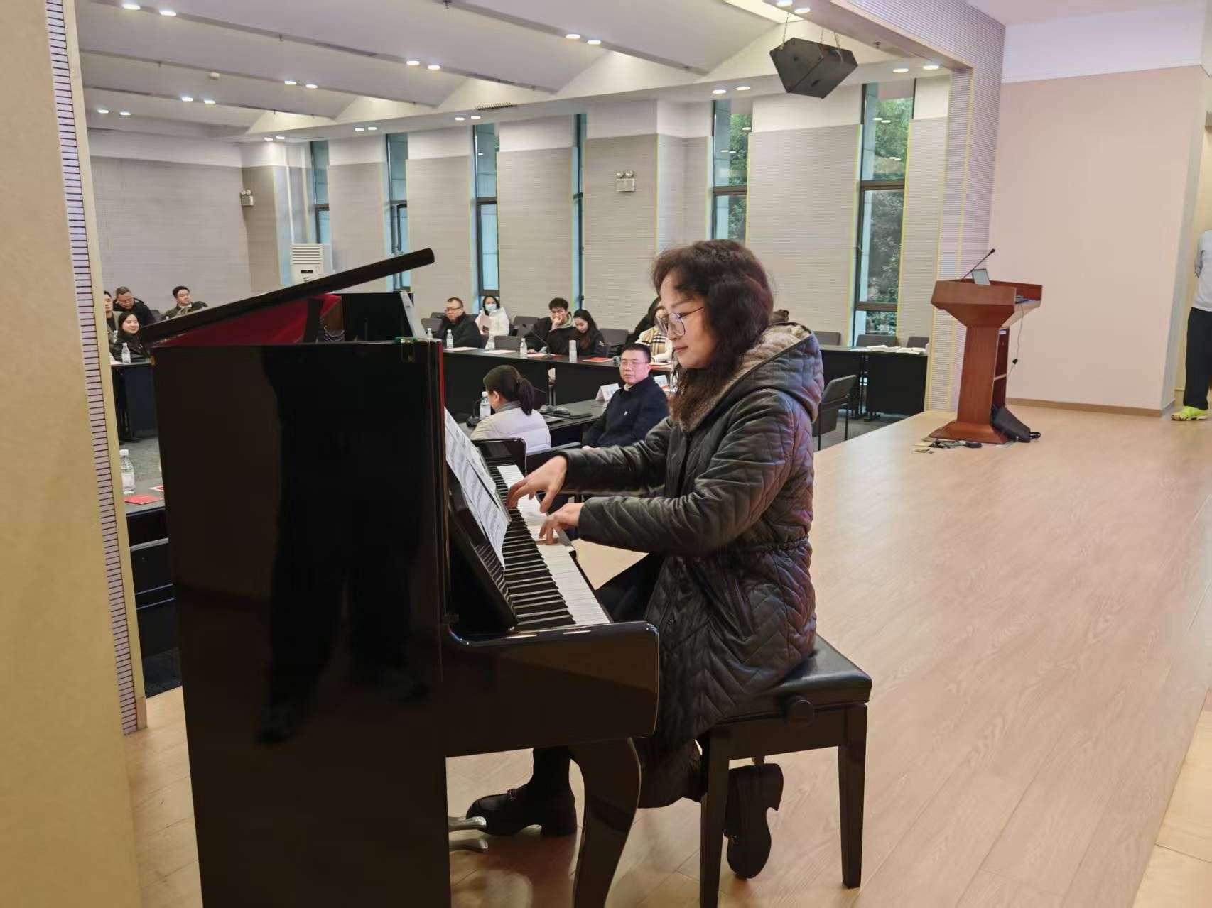 音乐系教师周珏表演了钢琴独奏《红星闪闪》,尹恒、鄢岚、陈燕、秦勤等4位老师合唱《世界赠与我的》,全场起立合拍共唱。