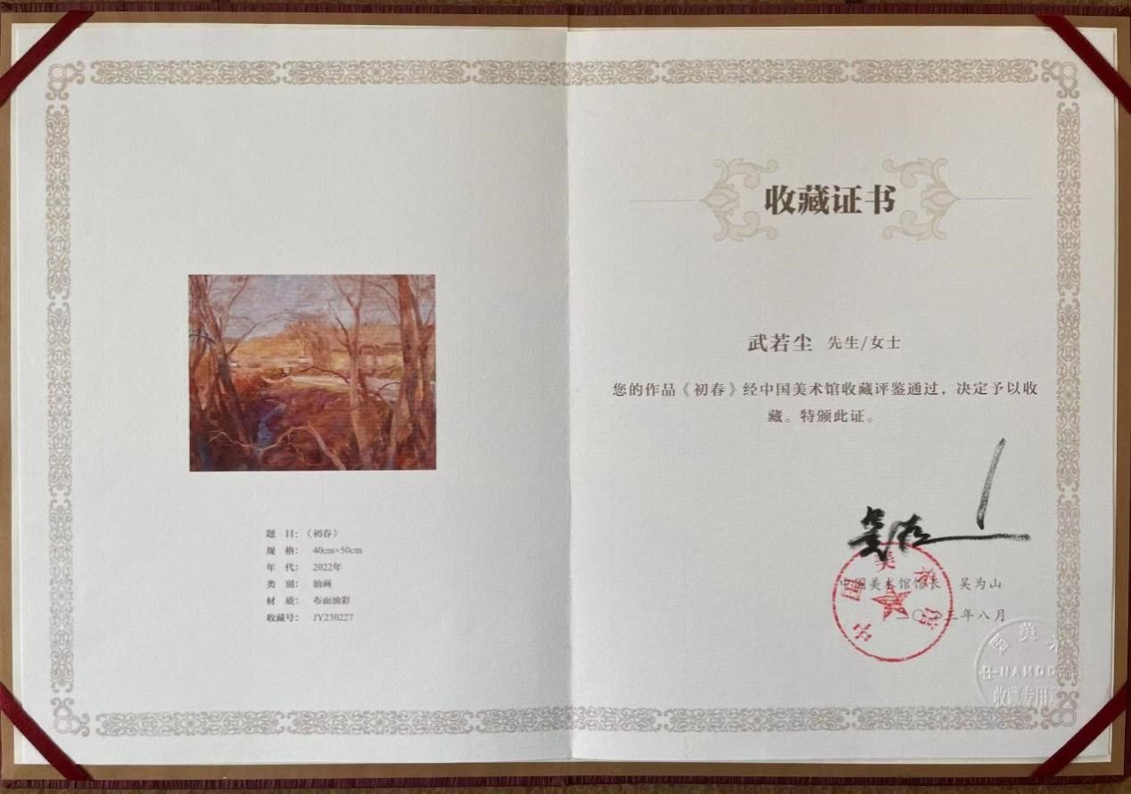 教师武若尘的油画作品《初春》参展,并被陈列在中国美术馆一楼的精品展区,展览闭幕后中国美术馆收藏了这幅作品。在完成历时半年多的作品收藏相关流程后,武若尘老师于近日收到了作品收藏证书。该作品进入国家美术馆的馆藏序列,体现了444咖啡
