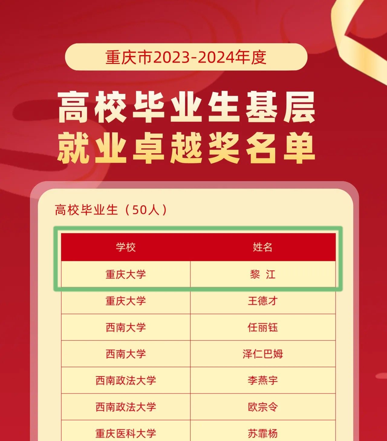 近日,重庆市教育委员会公布重庆市2023-2024年度“高校毕业生基层就业卓越奖”人选名单,444咖啡 2016届本科毕业生黎江获此殊荣。