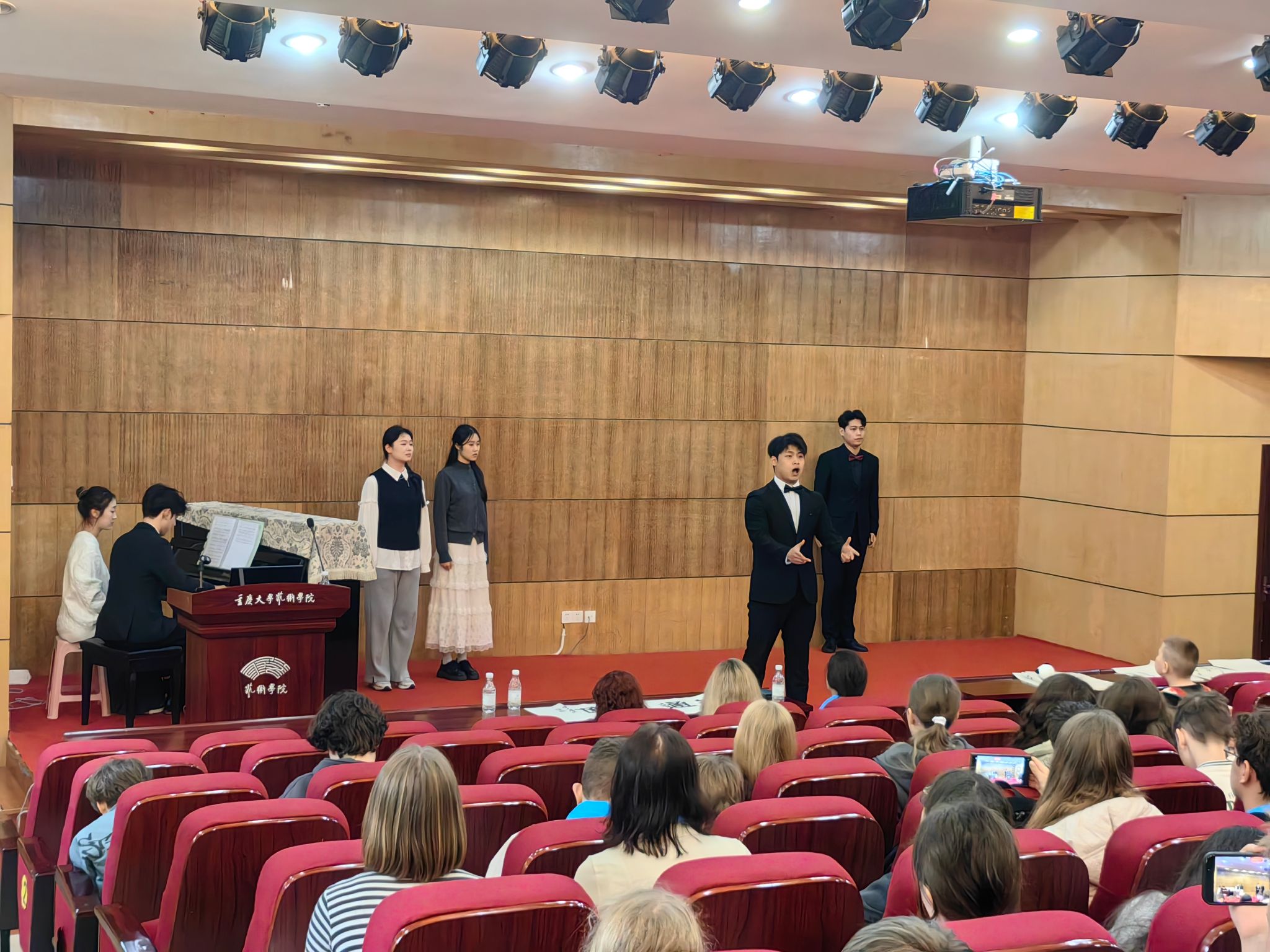 音乐系学子倾情献艺,凭借扎实的专业功底与婉转悠扬的旋律,带来经典曲目表演。中俄艺术在舞台上交相辉映,歌声与掌声交织回荡,报告厅内洋溢着欢乐和谐的跨文化交流氛围。